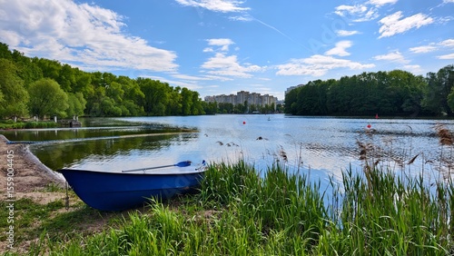 A plastic boat is moored on the lake shore next to a sandy beach and reeds. On the far shore are houses and trees. There are buoys on the water. There is a pier nearby. Sunny spring weather