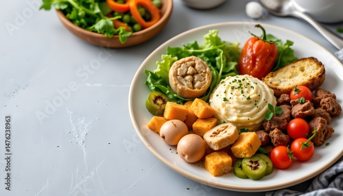 plate, food, assortment, appetising, salad, breadstick, tomatoes, white plate, variety, dish