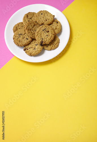 cookie, cookie, biscuit, biscuit, oat, raisin, home cooked, baking, baked goods, plate, dish, food, colours, colourful, background, bright, vibrant, pink, hot pink, yellow, border, blank space