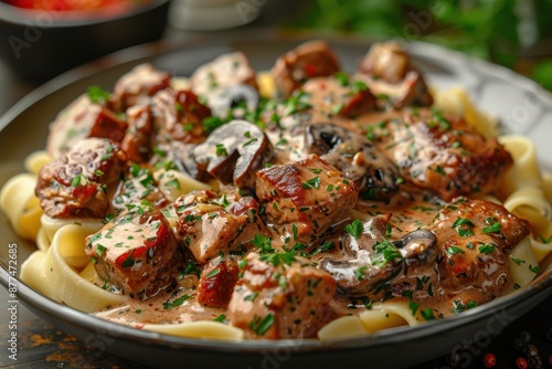 A plate of beef stroganoff with tender beef strips in a creamy mushroom sauce, served over a bed of egg noodles.