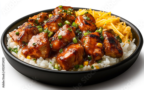 a plate of chicken stroganoff with rice and cheese on the side, isolated on a whit