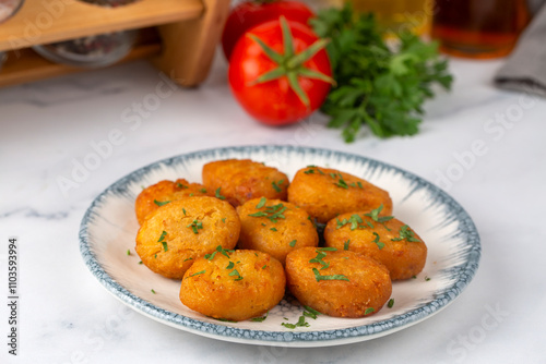 A plate of delicious fried potato patties (Turkish name; patates koftesi)