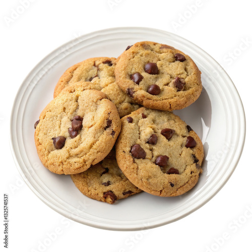 A plate of freshly baked chocolate chip cookies, golden brown and soft, invitingly stacked for enjoyment isolated on transparent background.