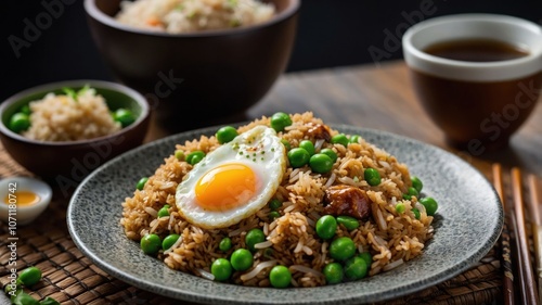 A plate of fried rice topped with a fried egg and green peas, served with side dishes.