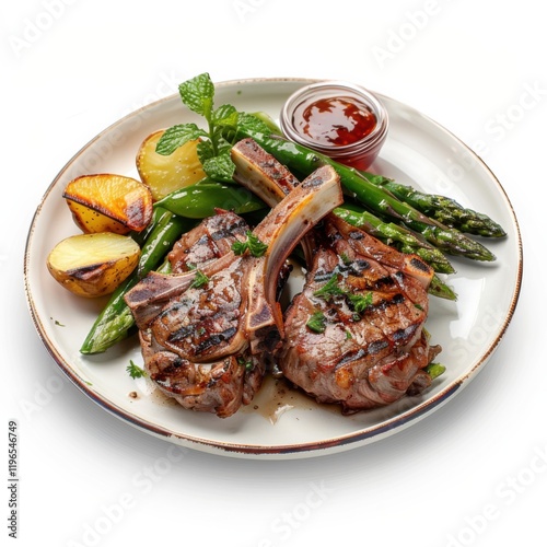 plate, grilled, lamb, chop, mint, jelly, roasted, potato, steamed, asparagus, isolated, white, background, art, style, flat, photo, side, view, juicy, vibrant, vegetable, resolution, no, additional, condiment, side