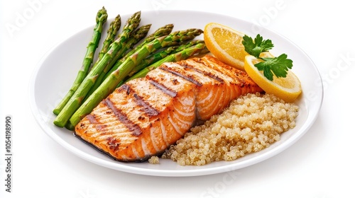 A plate of grilled salmon, asparagus, and a side of quinoa on a white background, ideal for clean eating and healthy living content.