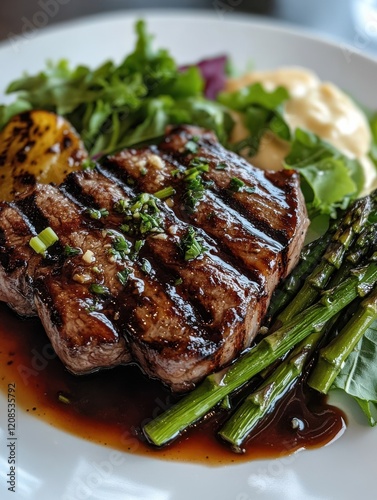 A plate of grilled steak with buttered asparagus and leafy greens, representing a keto diet meal rich in protein and fat