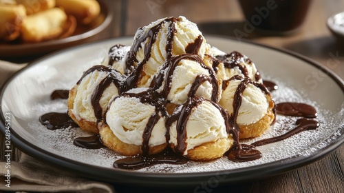 A plate of ice cream-filled profiteroles, topped with a drizzle of chocolate sauce and powdered sugar.