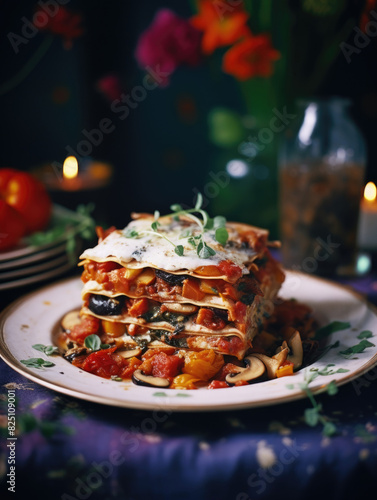 A plate of lasagna with a lot of vegetables and cheese. The plate is on a table with a vase of flowers and candles