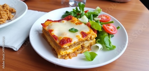 A plate of lasagna with a side of salad.