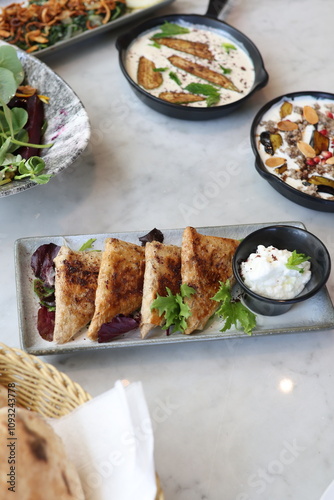 A plate of Lebanese arais, grilled flatbread stuffed with savory chicken filling, served alongside a creamy labneh dip and fresh greens, offering a delicious Middle Eastern appetizer.