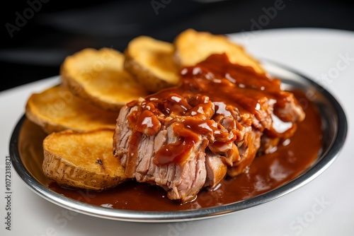a plate of pork meat BBQ in teriyaki sauce with crispy fried potato slices