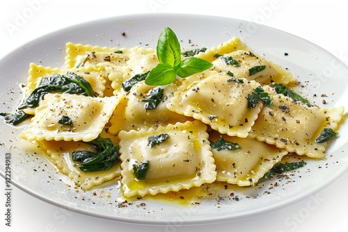 plate, ravioli, spinach, ricotta, filling, drizzled, butter, sauce, professional, photo, studio, lighting, background, advertising, elegant, minimalist, design, hyper, realistic, isolated, white