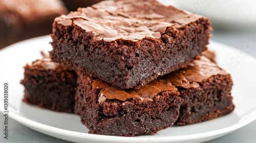A plate of rich, fudgy brownies stacked neatly, showcasing their shiny top and moist interior, perfect for dessert lovers.