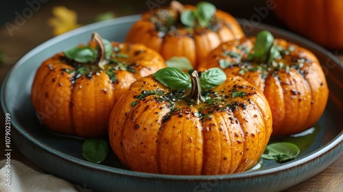 pumpkin, herb, plate, food, cooking, autumn, decoration, meal, orange, garnish, vegetable, cookery, seasonal, fresh, healthy, ingredient, dish, favor, presentation, dinner, receipe, nature, organic, harvest, culinary, vibrant, round, rustic, tasty, appetising, nourishment, vegetarian, epicure, comfort, colours, texture, aroma, serve, platter, green, basil, spice, local, farm, fall, warmth, gathering