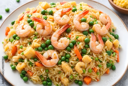 A plate of shrimp fried rice with plump shrimp scrambled eggs peas and carrots, Ai Generated