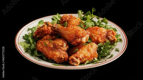 A plate of spicy fried chicken wings garnished with fresh herbs on blurred background