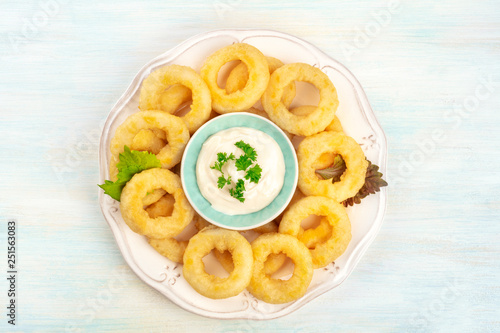 A plate of squid rings, shot from above with a mayo sauce and copy space