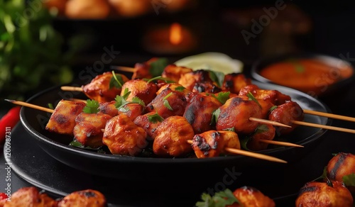 tandoori, chicken, skewer, plate, dark, background, grilled, spicey, indian, cookery, bar-b-q, food, roasted, delicious, savoury, meal, herb, spice, exotic, traditional, dish, culinary, aromatic, dining, protein, flavorful, cooked, marinated, garnish, platter, vibrant, smoky