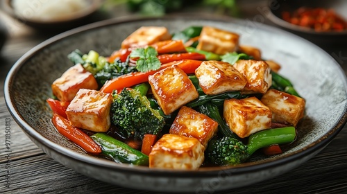 A plate of Thaistyle stirfried mixed vegetables with tofu, Thai stirfried vegetables, vegetarian option