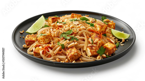 A plate of vegan pad Thai with tofu, rice noodles, and crushed peanuts, served with lime wedges