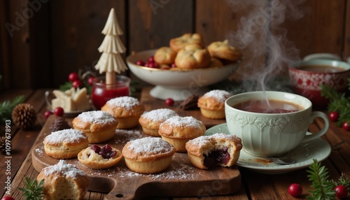 A plate of warm mince pies, lightly dusted with powdered sugar, rests beside a steaming cup of tea on a rustic wooden table. The setting evokes a cozy winter atmosphere