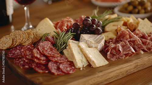 A platter of artisanal cheeses and charcuterie displayed on a rustic wooden cutting board, paired with a glass of red wine, creating a sophisticated and elegant setting for a gourmet experience.