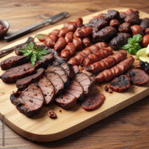 A platter of grilled meats including chorizo and morcilla served on a wooden board, outdoor cooking, traditional, argentine cuisine