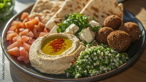 platter, mediterranean, including, hummus, centered, warm, sunlight, ambience, served, pita, bread