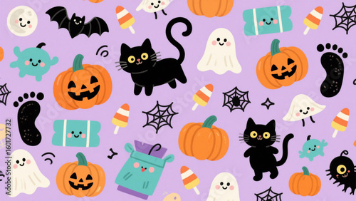 A playful and whimsical Halloween-themed illustration featuring a seamless pattern of cute, spooky elements on a soft lavender background. Halloween, Halloween Costumes, Halloween Background