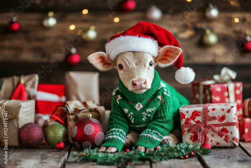 A playful calf in a green sweater and red Santa hat, surrounded by colorful presents, ornaments, and a rustic holiday setting.