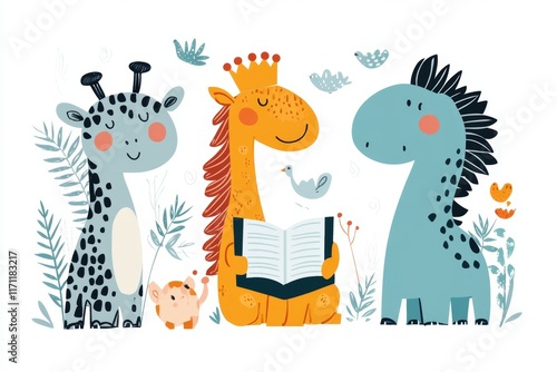 A playful illustration of a king reading a scroll, surrounded by whimsical animals, on a plain white background
