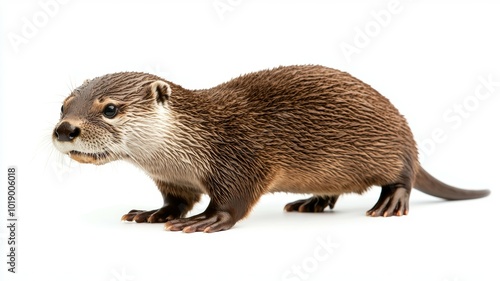 A playful otter exploring its surroundings in a bright, clean space during daylight hours