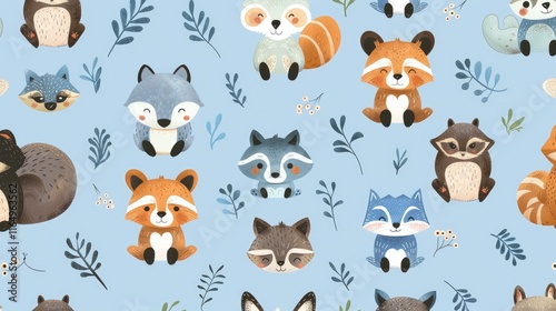 A playful pattern featuring cute illustrated woodland animals on a light blue background.