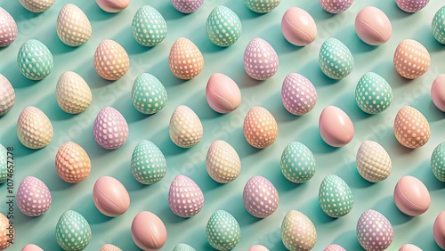 A playful pattern of pastel polka dot eggs on a soft blue background, showcasing a whimsical celebration of spring.