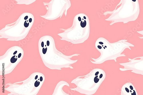 A playful pattern of various cartoon ghosts with expressive faces on a background. The ghosts have wide eyes and open mouths, evoking surprise or fright. Ideal for Halloween designs