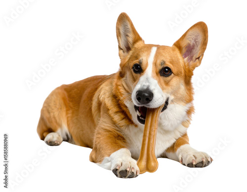 A playful Pembroke Welsh Corgi happily chewing a dog bone, embodying pet joy, training, and canine dental health.