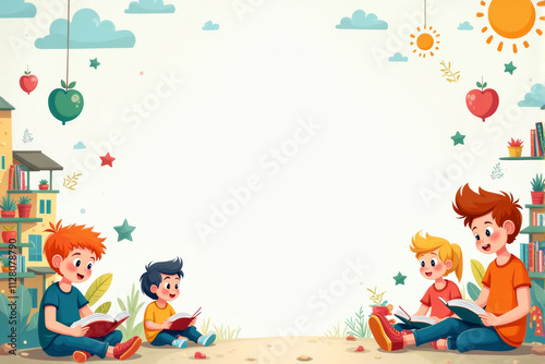 A playful school background illustration featuring kids playing, colorful school supplies, and fun learning icons in a lively composition..