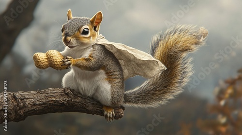A playful squirrel in a superhero cape, perched on a branch, holding a peanut like a trophy, ready to leap into action.