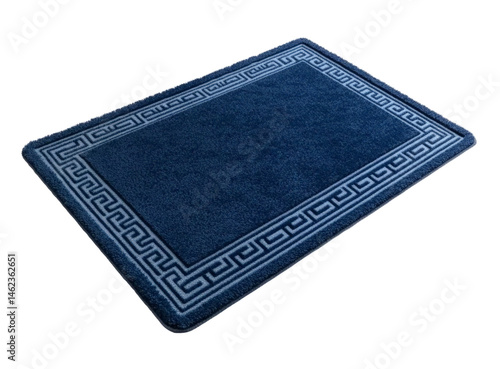 A plush navy blue area rug with intricate geometric patterns along the edges, set against a clean, white background, ideal for home decor or interior design projects