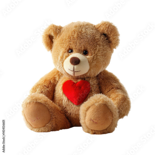 A plush teddy bear with a soft texture and a red heart on its chest, evoking feelings of warmth and affection.