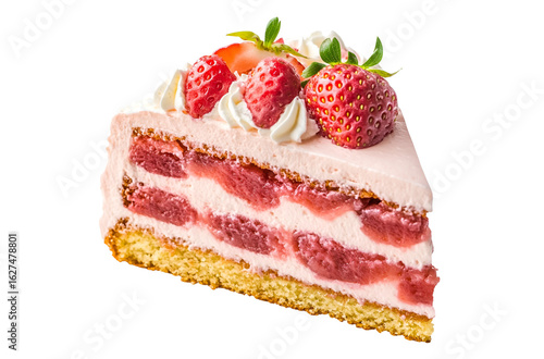 a PNG image of a slice of strawberry vanilla cake with cream and fresh strawberries, food photography