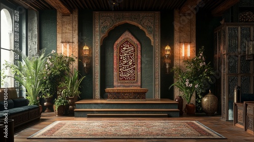 A podium featuring floral patterns and Arabic calligraphy, surrounded by rich Eastern decor elements