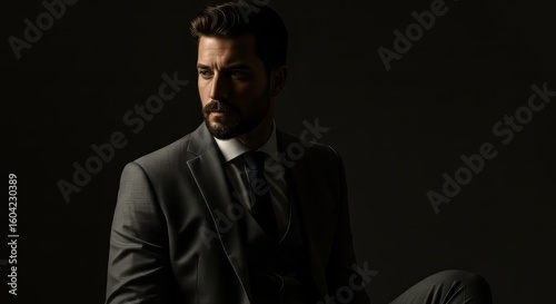 man, suit, elegant, portrait, beard, serious, confident, businessman, professional, dark background, fashion, style, tailored, attaching, white shirt, male model, studio shot, photogenic, looking away, thoughtful, pensive, classic, masculinity, stylish, sophisticated, monochrome, low key, dramatic, business attire, well-dressed, executive, modern, attractive, business, person, dark, face, man, guy, model, people, black, shirt, boy, 1, cool, looking