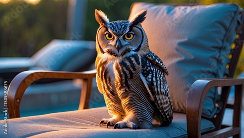 A poised owl with striking yellow eyes perched on a wooden chair at sunset, showcasing vivid feather patterns and a serene background