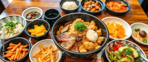 table setting, meat, food photography, colours, korean food, east asia, home cooking, culinary, still life, egg, topview, wooden table, vegetable, traditional, bowl, healthy, vibrant, gastronomy, soy sauce, closeup, rice, south korea, kimchi, asia, appetising, delicious, texture, authentic