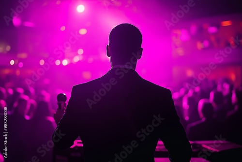 politician, crowd, speech, microphone, dramatic, lighting, faceless, purple, silhouette, event, audience, persuasion, propaganda, minimalistic, backlit, performance, communication, influence, gathering, conference, public, leader, stage, emotion, social, engagement, business, politic, power, presentation, show, entertainment, sharpened, abstract, artistic, modern, vibrant, theme, atmosphere, spectacle, ceremony, celebration, connection, interaction