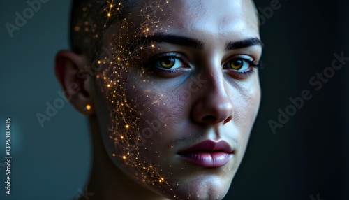 A polygonal male face with digital elements, representing a futuristic visualization of artificial intelligence and neural networks in technology.