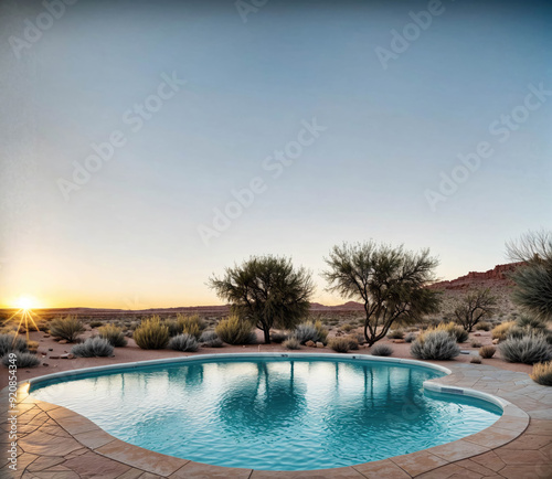 A pool with a sunset in the background
