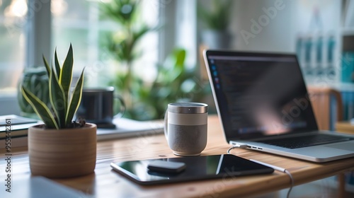 A portable Bluetooth speaker with a modern design, playing music on a clean desk.